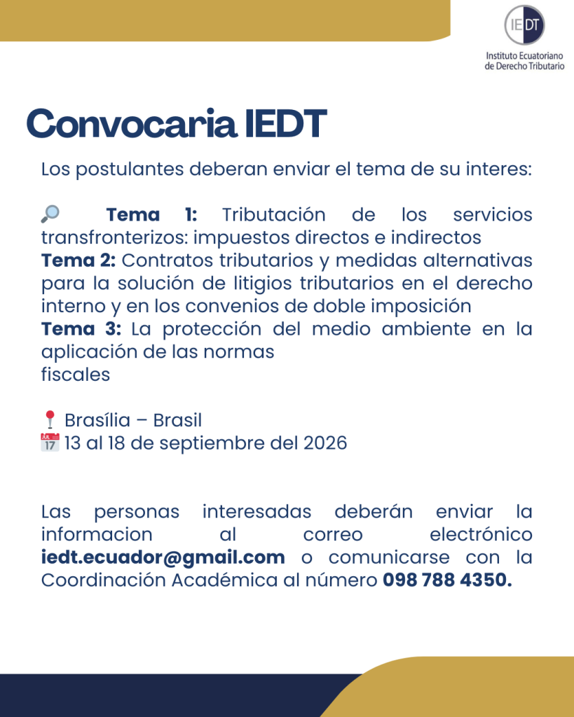 IEDT Tax Review es una publicación especializada en el ámbito del derecho tributario, asociada al Instituto Ecuatoriano de Derecho Tributario (IEDT). Este tipo de revista proporciona un espacio para la difusión de investigaciones, análisis y debates sobre temas relevantes en materia fiscal.